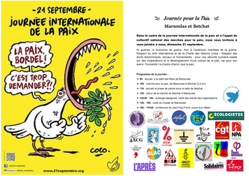 Dans le cadre de la journée internationale de la paix (https://www.un.org/fr/observances/internation…) et à l'appel du collectif national des marches pour la paix(https://www.collectifpaix.org/nous/#appel) , nous vous invitons à vous joindre à nous, dimanche 21 septembre.