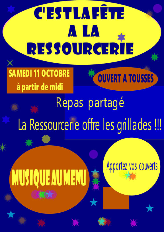 Samedi 11 octobre. Repas partagé en musique. La Ressourcerie offre les grillades et le vin !