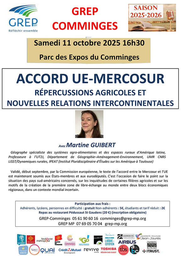 Notre conférencière Martine Guibert est une géographe toulousaine, professeure à l'Université Jean-Jaurès et spécialiste de l'Amérique latine, et particulièrement des politiques agro-industrielles qui caractérisent ce "sous-continent", et elle saura nous éclairer sur tous les enjeux liés à la ratification (ou non) de cet accord qui qui d'être signé par Ursula von der Layen.