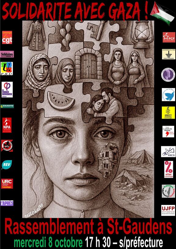 Et restons solidaires du peuple palestinien, notamment à Gaza où le génocide continue : bombardements, invasion de l'armée israélienne, famine organisée...