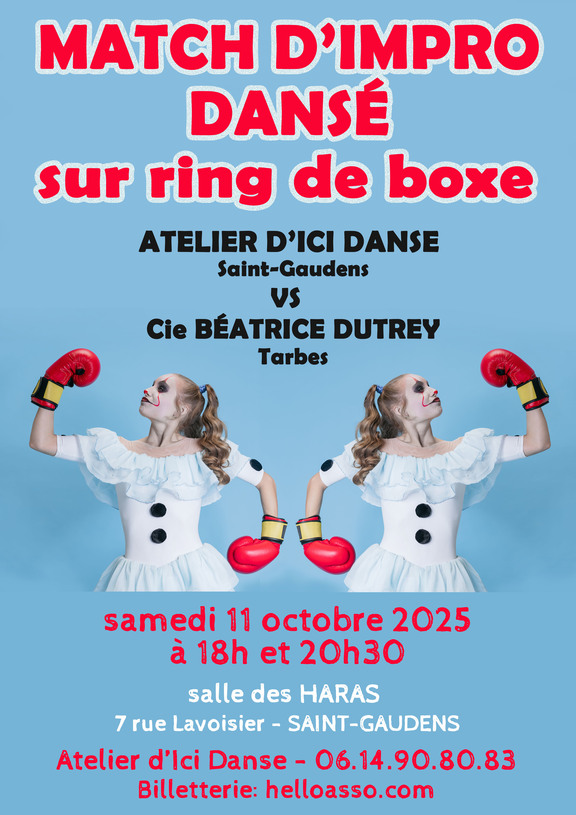 Sur le modèle des matchs d'impro en théâtre, 2 équipes composées chacune de 6 danseuses se retrouveront sur un ring de boxe pour quelques joutes festives de courtes improvisations dansées. Le public sera invité à voter à l'issue de chaque round pour choisir l'équipe qui aura le mieux performé. Mais vous l'aurez compris ce match est surtout prétexte à une jolie rencontre entre des danseuses issues de 2 écoles de danse, l'Atelier d'Ici Danse et l'Ecole de danse de Béatrice Dutrey de Tarbes.