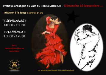 L'Andalousie s'invite dans le petit village de Soueich, c'est au Café du pont (salle du haut, plancher oblige) que nous vous donnons rendez-vous pour découvrir deux univers corporels et rythmiques.