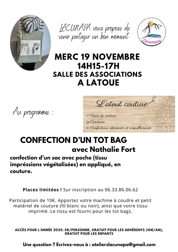Participation de 10€. Apportez votre machine à coudre et petit matériel de couture (fil blanc ou noir), ainsi que votre tissu imprimé. Le tissu est fourni pour les tot bags.