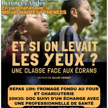 « Et si on levait les yeux ? » est une expérience unique menée par un instituteur réalisateur et sa classe de CM2. Pendant 1 an, Gilles Vernet va échanger avec ses élèves, leurs parents et des spécialistes sur la place des écrans dans notre société, avant de les emmener pour 10 jours de déconnexion en pleine nature. C'est un film où l'on tutoie le bonheur, l'envie de vivre ensemble et où l'on respire 🌿. Le documentaire sera suivi d'un échange avec une professionnelle de santé.