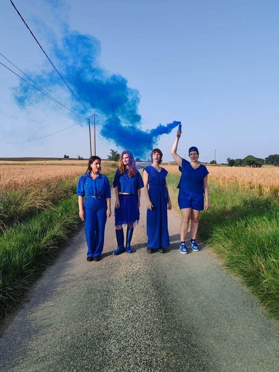 Quatre entités s'incarnent dans un nuage de fumée bleue parce que le monde humain, paraît-il, court à sa perte. Elles viennent d'un ailleurs. Elles s'inquiètent d'imaginaires sidérés qui ne parviennent plus à rêver autre chose que la fin. Elles s'étonnent des fictions auxquelles les humain·es s'accrochent, celles qui les ont façonné·es. Leur méthode pour libérer les imaginaires, c'est de faire un acte rituel qui consiste à se laisser posséder par des figures réelles ou imaginaires. C'est un peu comme du théâtre si vous voulez, mais en magique.