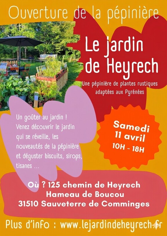 Pour fêter la nouvelle saison et l'ouverture de la pépinière "Le Jardin de Heyrech" pour cette année 2026, je vous propose un goûter au jardin : tisanes, sirops et biscuits à partager dans le jardin de 15h à 18h.
