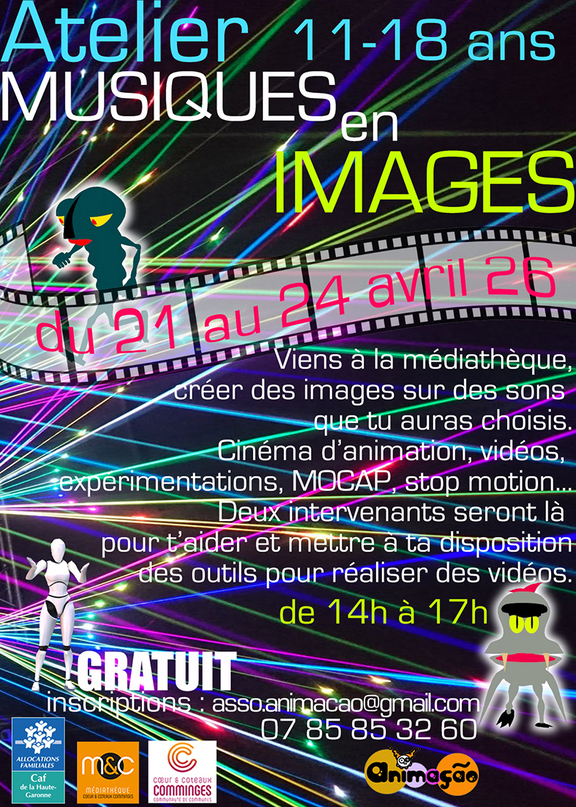 Durant 4 demi-journées de 14h à 17h, un groupe de jeunes va se retrouver, accompagnés par deux intervenants de l'association Animação, afin de créer des images animées à partir de musiques découvertes à la médiathèque.