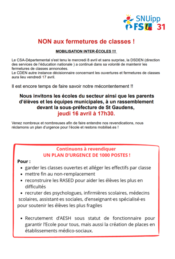 Nous invitons les écoles du secteur ainsi que les parents d'élèves et les équipes municipales, à un rassemblement devant la sous-préfecture de St Gaudens, jeudi 16 avril à 17h30.