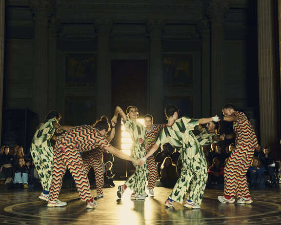 Musique électronique jouée en direct, voix envoûtante qui s'y fond et costumes alliant folklore et modernité unisexe vous embarqueront dans ces rondes magnétiques au rythme changeant, aux regards croisés, au contact et à la proximité de chaque instant où le collectif porte l'individu. Après les représentations au Panthéon et au château de Chambord nous avons hâte de voir comment ce spectacle investira le miroir d'eau du square Azémar.